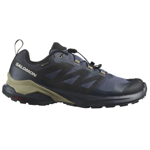 SALOMON X Adventure GTX-Multifunktionsschuh für Herren, Obermaterial atmungsaktives Mesh mit Softmaterial sowie Gummiumrandung kombiniert. Ein vielseitiger Schuh für unterschiedliche Einsätze, ein echtes Allroundtalent. Für den Beruf, das Hobby und die Freizeit geeignet. Wasserdichte GORE-TEX® Membrane für alle Jahreszeiten. Das Sensifit®-System umschliesst den Fuss für präzisen und sicheren Sitz. Textilfutter und auswechselbares Textilfussbett aus Schaumstoff. Mit EVA-Dämpfungszwischensohle und rutschfester All Terrain Contagrip®-Aussensohle aus Gummi, welche mit ihrer auf Haftung ausgerichteten Materialmischung und ihrem tiefen, scharfkantigen Stollendesign für maximalen Grip auf losem, weichem, schroffem oder unebenem Untergrund sorgt.