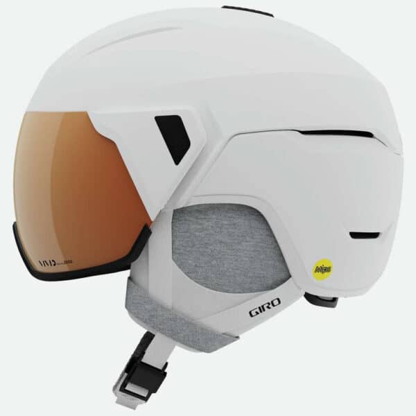 Der Aria MIPS® Shield-Helm bietet Komfort am Berg und verfügt gleichzeitig über ein zukunftsweisendes Design gepaart mit modernsten Funktionen. Das Visier lässt sich dank dem neuen Mechanismus leicht vorziehen und auf dem Helm platzieren – eine grossartige Option für Brillenträger. Die Vivid Scheibentechnologie von Zeiss, die beim Visier zum Einsatz kommt, verstärkt die Kontraste im Schnee und sorgt so für eine erheblich bessere Sicht. Die MIPS Spherical Technolgie sorgt nicht nur dafür, dass die Rotationskraft bei einem Sturz minimiert wird, sondern verfügt ausserdem über zwei Helminnenschalen in unterschiedlichen Dichten um unterschiedlich starke Schläge bestmöglich zu absorbieren. Zu guter Letzt sorgt die Thermostat-Steuerung für ein optimales Klima im Helminnern.